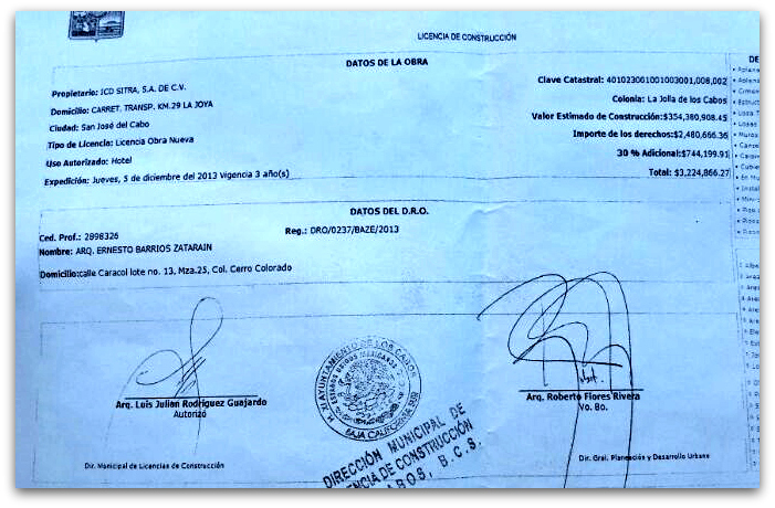 Pero como se sabe que dicha oficina tarda meses en dar trámite a las solicitudes, en una copia que fue hecha llegar a la redacción de Colectivo Pericú se sabe que el aval para la construcción de dicha torre para hotel en una zona residencial, fue autorizada por el propio arquitecto Roberto Flores Rivera a la empresa SITRA, S.A. de C.V. el jueves 5 de diciembre de 2013, por la que el ayuntamiento cobró la cantidad de tres millones 224mil 806 pesos (ver documento).