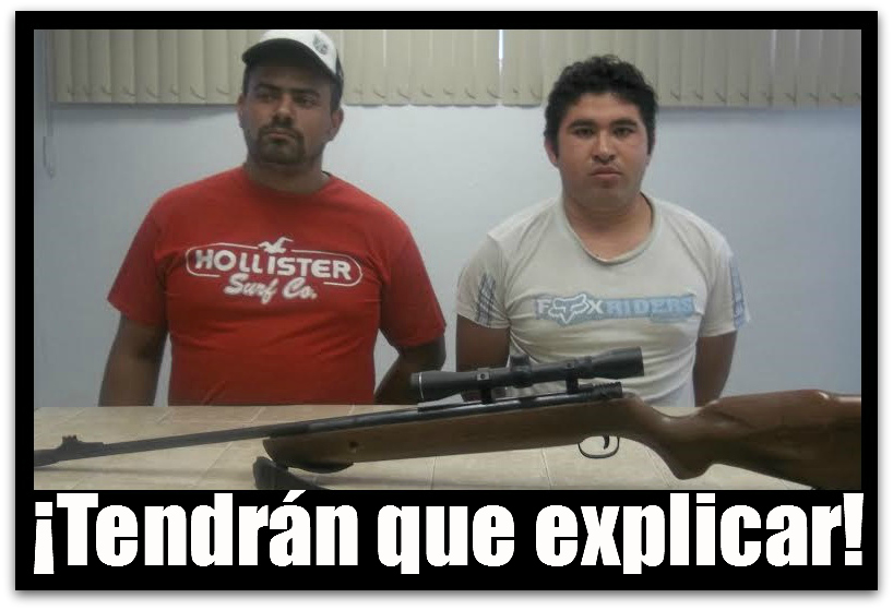 Sobre el asiento encontraron un rifle con mira telescópica color negro de la Marca Mendoza, Calibre 5.5, con la Leyenda RM-600. Ahí mismo fueron asegurados Daniel Arturo Cervantes Moreno de 20 años de edad y el conductor del vehículo pick up Chevrolet S-10 de nombre José Ramón Veliz Ortega de 25.