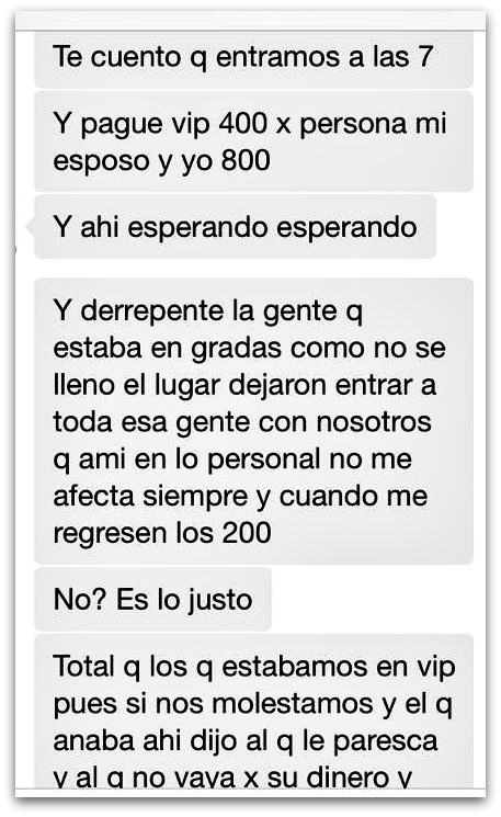 Ante la inconformidad, los organizadores pidieron que pasaran a taquilla donde se les reintegraría el costo del boleto de 400 pesos, pero resulta que no todos alcanzaron a hacer el canje debido a que se acabó el dinero.