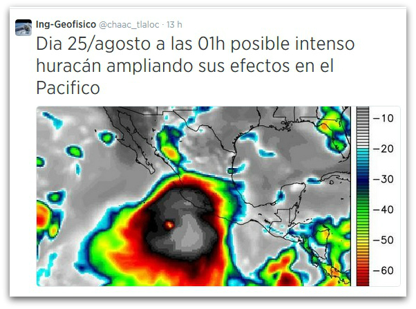 Que weyes desde hace meses los gringos pronosticaron no se cuantos huracanes para el pacifico y cabe la posibilidad de que alguno llegue y hace cientos de años los habitantes de la media peninsula sabemos que es temporada de huracanes, asi que chequen el NOAA y por el momento no hay ningun huracan frente a cabo esa imagen esta mas truqueada y el Metereologico Nacional, CFE y CNA TODOOOS se basan en esa informacion del NOAA para que se hacen Endejoooos y los que somos de aqui y los que ya tienen rato avencindados en BCS saben que precauciones tomar (no estaria mal que se los digan a los tagualilas recien llegados) que hasta por un pinchi trueno corren.