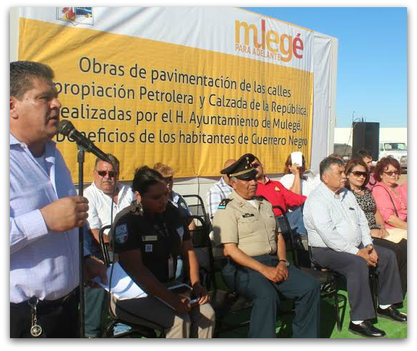2 - 1 guille en guerrero negro pavimentoPresentes, como testigos del banderazo estuvieron: Arely Camarena de Santillán, Presidenta del Sistema DIF Mulegé; Rafael García Vizcaíno, Secretario General;  Guadalupe Benjamín Arce, Delegado Municipal; Raúl Lyle Fritch, Primer Regidor; Liliana Lyle Fritch, Directora de la UABCS Campus Guerrero Negro; Sergio Osuna Jiménez, Director del Cobach 07; Luz del Rocío Sánchez, Directora de DIF Delegacional; Jorge Cázares, Gerente de Oomsapas Guerrero Negro; Juan Álvaro Miranda Alvarado, Secretario General del Sindicato Salinero; María del Pilar Ruiz, Encargada del Despacho de Migración en la Zona Norte; Gerardo López, Responsable de Protección Civil; Aarón Rojas Zúñiga, en representación del SUTERM.