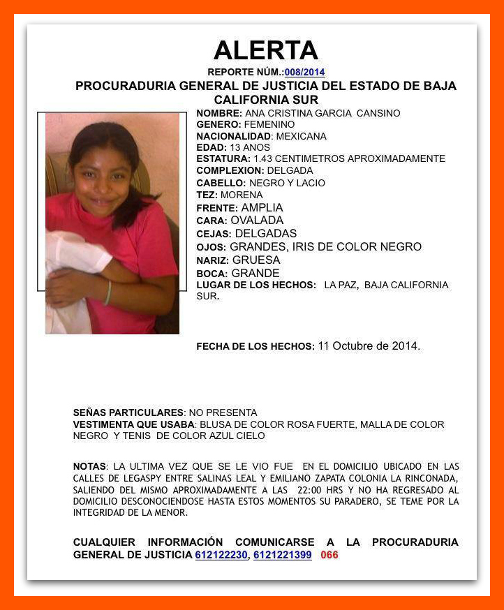 Alerta Amber Baja California Sur solicita su apoyo para difundir los datos y ficha de localización de la menor Ana Cristina Garcia Cansino de 13 años de edad, desaparecida el dia 11 de octubre del presente año en la Ciudad de La Paz.