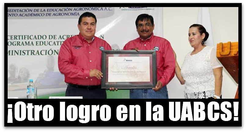 La Paz, B.C.S.- De manos de la M. en C. María Teresa Mondaca Cota, Vice-Presidenta del Comité Mexicano de Acreditación de Educación Agronómica (COMEAA), el Rector Gustavo Rodolfo Cruz Chávez recibió el certificado que avala a la Licenciatura en Administración de Agronegocios como programa de buena calidad, por un lapso de 5 años, con lo que la UABCS se suma otro gran éxito en su carrera por la excelencia académica.