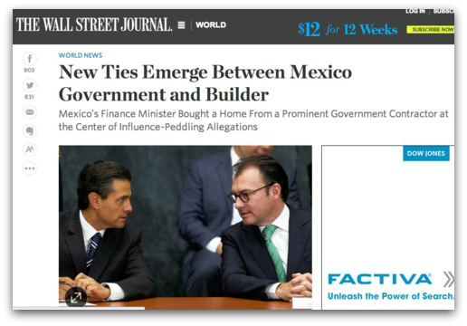 Inmediatamente a los casos Ayotzinapa- Casa Blanca, se sumaron denuncias (9-dic-14) del influyente Walt Street Journal, referidos a que el secretario de hacienda, Luis Videgaray, también tiene una propiedad de 7.5 millones adquirida al consorcio HIGA en ídem buenas condiciones a la “Casa Blanca”, evidenciando de nuevo los millonarios y escandalosos conflictos de interés entre funcionarios públicos –la señora Rivera lo es aunque lo nieguen oficialmente- y proveedores gubernamentales.