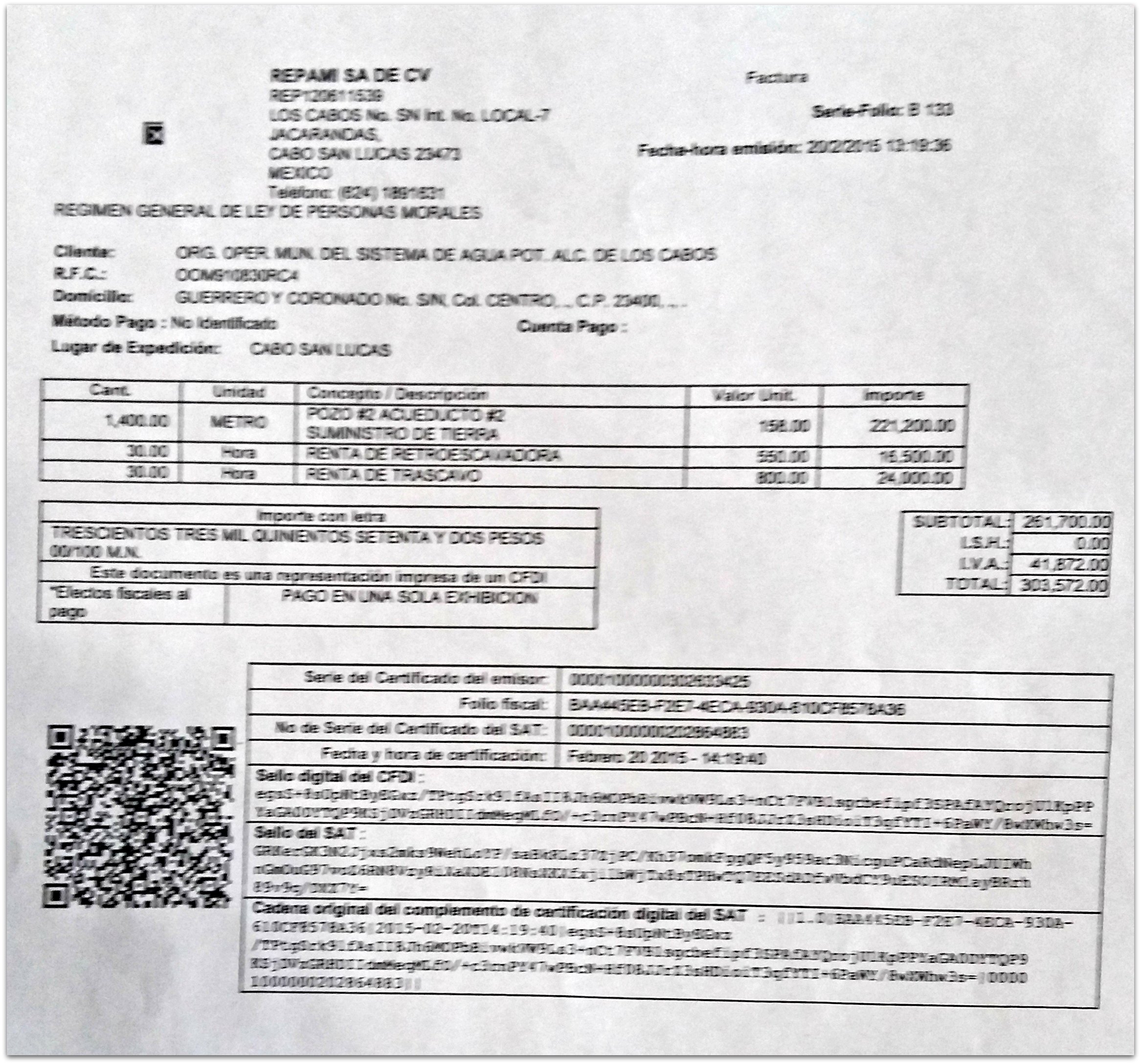San José del Cabo, B.C.S.- Luego de que fuera sorprendido Luis Miguel Agúndez Montaño cobrando la cantidad de 518 mil 172 pesos en efectivo (ver documentos), por supuestos trabajos de acarreo de tierra para el Pozo 2 del acueducto 2, respaldado en facturas «infladas» el mes de febrero anterior, se encendieron los focos rojos en la dependencia debido al saqueo indiscriminado que a lo largo de un año se está haciendo de los recursos, con cargo a los usuarios.