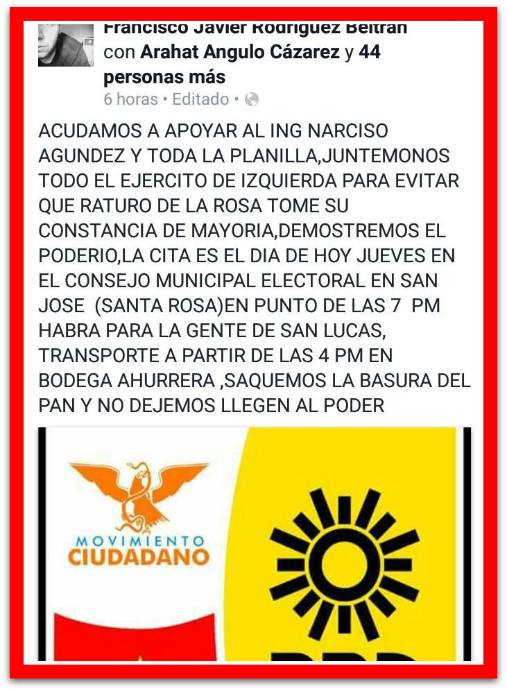 Y es que los ha citado para la toma violenta de las oficinas del Comité Municipal Electoral ubicado en la calle Cabo Pulmo y carretera federal de la colonia Santa Rosa para este jueves a las 7 de la tarde.