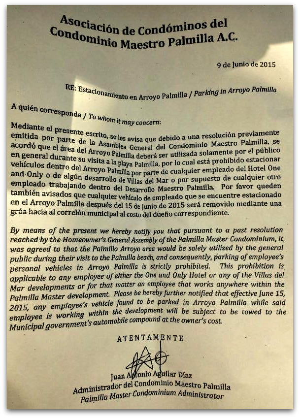 De entrada el desarrollo Palmilla es un desarrollo PRIVADO y ellos tienen el derecho de cuestionar a quien pretenda acceder a la playa pública a través de su propiedad y además el documento es un claro que o que pretenden es que cualquier persona que labora dentro de Palmilla NO utilice el área de estacionamiento que fue designado para el publico general que visita la playa ( osea nosotros), quien fue el/la Pendej@ mitoter@ que empezó este arguende de tres pesos??