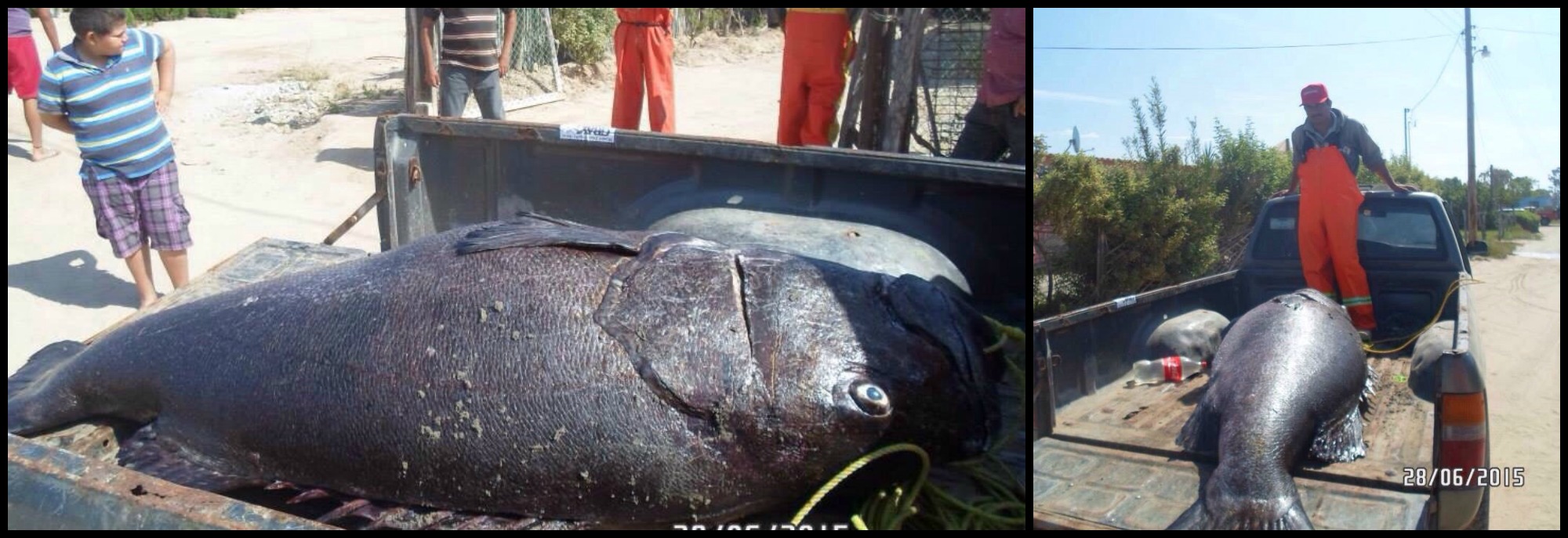 El enorme pez (epinephelus quinquefasciatus) tuvo un peso de casi 400 kilos y apenas cupo completo en la caja de la camioneta pick up.