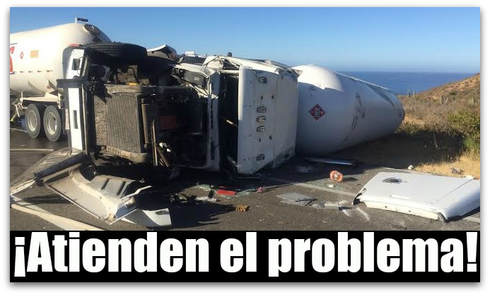 La madrugada de este lunes, corporaciones de emergencia acudieron al kilómetro 67 de la carretera que va de Todos Santos a Cabo San Lucas, donde se volcó una pipa de la empresa CALI GAS donde, para fortuna, no existió fuga que pusiera en peligro mayor a quienes transitan por esa vía. Del chofer se informa que está policontundido únicamente, sin revelar la identidad.