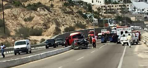 Esto ocurrió alrededor de las tres de la tarde de hoy, en el sentido de Cabo San Lucas a San José del Cabo, donde cinco ambulancias, personal de Protección Civil, Policía Federal y Bomberos establecieron los protocolos para la evacuación de las personas que resultaron con golpes, situación que se complicó debido a que es un horario de intenso tráfico.