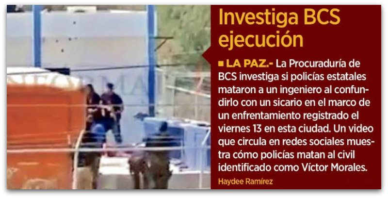 Viene todo esto a colación por la muerte temprana de un inocente joven en el juego cruzado entre policías y matones a sueldo. Le llamo juego cruzado porque la verdad hay que decirla. Los uniformados de la SSPBCS que fueron videograbados por novatos camarógrafos dan cuenta de como reinaba el descontrol entre ellos mismos mientras caía abatido el joven Ingeniero Victor Manuel Morales Zúñiga. Dicen los uniformados que fueron sorprendidos por los sicarios y que los agarraron en posición de firmes. Lo creo, mas repruebo tajantemente el proceder de estos elementos de seguridad pública, los cuales no están capacitados ni para cargar una resortera.