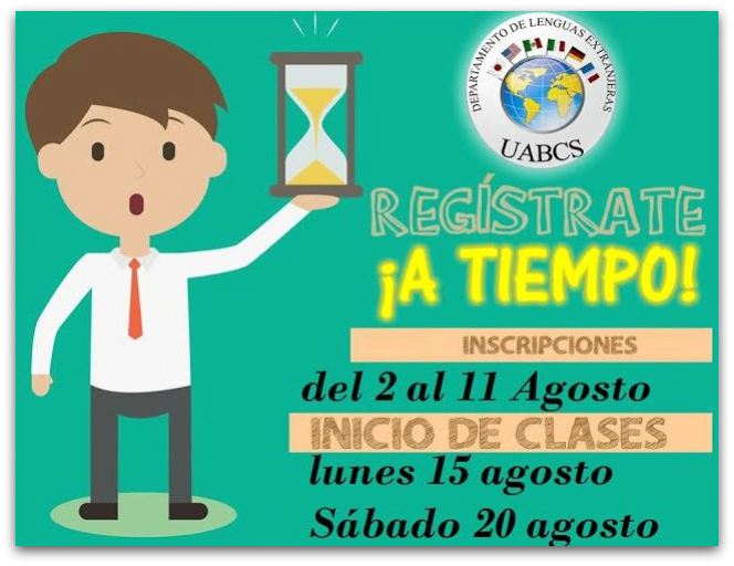 La Universidad Autónoma de Baja California Sur, a través del Departamento de Lenguas Extranjeras, invita a los cursos intensivos de idiomas 2016-II que se llevarán a cabo del 15 de agosto al 6 de octubre. Las inscripciones se realizarán del 2 al 11 de agosto, en un horario de 9:00 a 13:30 y de 17:00 a 19:30 horas.