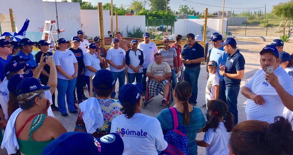Este fin de semana los integrantes del Comité Directivo Estatal (CDE) y el Comité Directivo Municipal (CDM) de La Paz, con el apoyo del diputado por el IV distrito Marco Antonio Armendáriz Puppo, se coordinaron con vecinos de la colonia Olas Altas con la finalidad de trabajar en conjunto para rehabilitar el parque vecinal de su colonia. En esta jornada del programa Súmate, se remozó la cancha de futbol, se rehabilitaron los juegos infantiles y ring de boxeo, así como se realizaron trabajos de pintura en guarniciones, paredes y fachada.