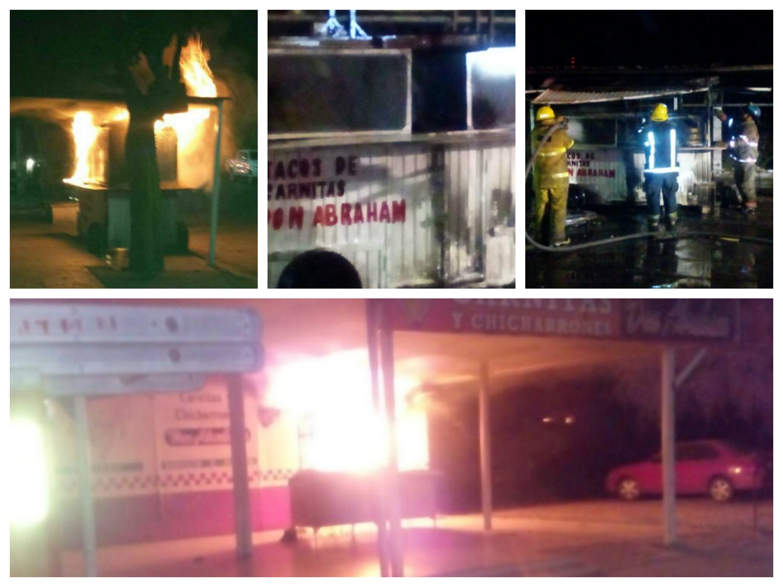0-a-a-abraham-carnitas-negociosEn solamente tres  horas aproximadamente fueron provocados cinco incendios en los puestos de “Tacos Carnitas Don Abraham”, en diferentes y distantes puntos de esta capital del estado, causando pérdidas totales y sin víctimas humanas, pero lo cual se considera como una advertencia a los propietarios por razones que hasta ahora no se conocen, pero que se les relaciona con gente del narco.