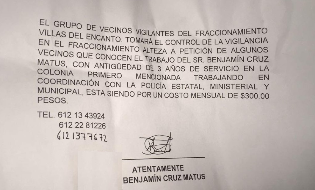 Hoy los vecinos de las colonias se sorprendieron y manifestaron su inquietud y coraje al recibir un volante firmado por una persona de nombre Benjamín Cruz Matus, quien hace del conocimiento de tomar el control de vigilancia en el programa “Vecinos Vigilantes”, pero mediante un costo para sus habitantes.