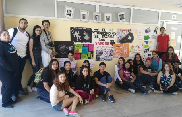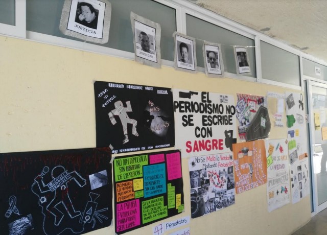 Los alumnos colocaron cámaras fotográficas, libretas y flores blancas bajo las fotografías de periodistas asesinados, como Héctor “El Gato” Félix Miranda, quien fuera cofundador del Semanario Zeta, asesinado en 1988; Regina Martínez, corresponsal de Proceso, asesinada en Veracruz en 2012, y los más recientes de Cecilio Pineda (Guerrero), Ricardo Monlui (Veracruz) y Miroslava Breach (Chihuahua), asesinados en este mes.