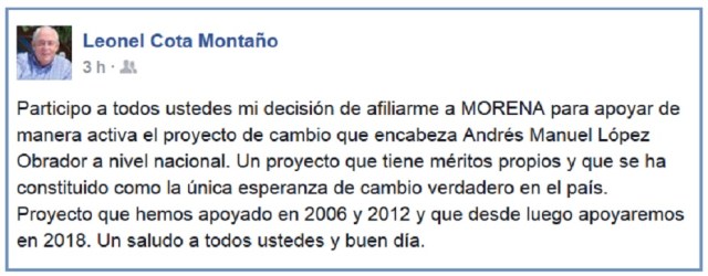 LCM escribió hoy en Facebook: “Participo a todos ustedes mi decisión de afiliarme a MORENA para apoyar de manera activa el proyecto de cambio que encabeza Andrés Manuel López Obrador a nivel nacional. Un proyecto que tiene méritos propios y que se ha constituido como la única esperanza de cambio verdadero en el país. Proyecto que hemos apoyado en 2006 y 2012 y que desde luego apoyaremos en 2018. Un saludo a todos y buen día”.
