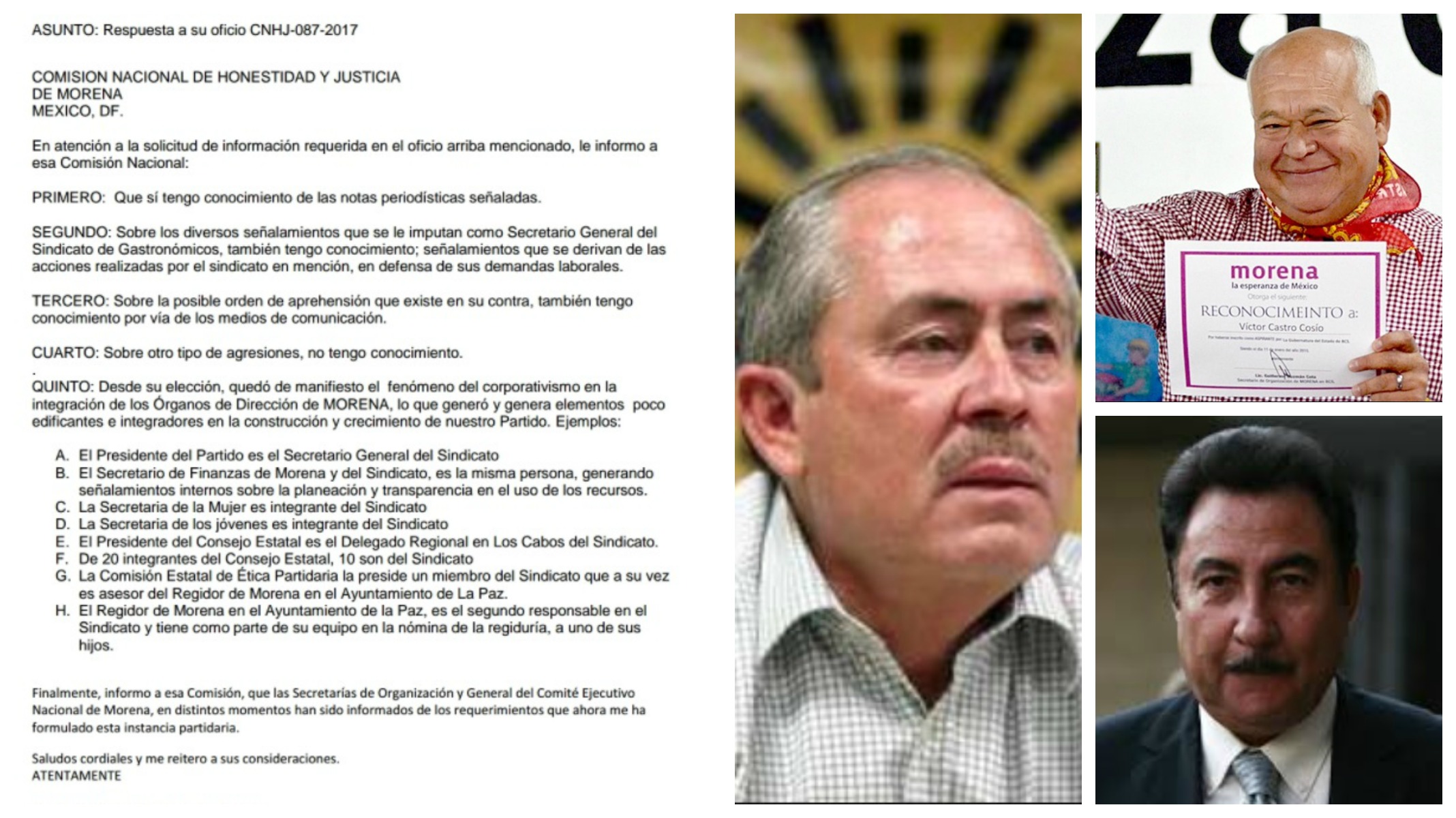 Lo que expresa Víctor Manuel Castro Cosío lo hace como «enlace» del Comité Ejecutivo Nacional de MORENA en Baja California Sur, cargo que no existe en el organigrama. Y hace afirmaciones sobre «recortes de periódico» que no tienen ningún efecto probatorio ya que se trata de simples suposiciones, además de que la actual dirigencia en el estado no ha sido notificada por los conductos formales.