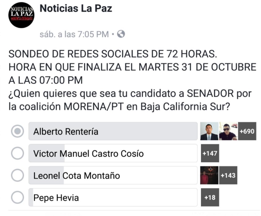 El sondeo realizado en redes sociales vía Medios Digitales del Pacífico en dónde puso cara a cara a los aspirantes por el partido del Movimiento de Regeneración Nacional (MORENA) para contender por la candidatura a SENADOR, que dio inicio el Sábado 28 de Octubre y finalizó hace unos momentos después de las 07 de esta noche del 31 de octubre, el sondeo de redes sociales arrojó los siguientes resultados, que dan el gane a Alberto Rentería Santana.