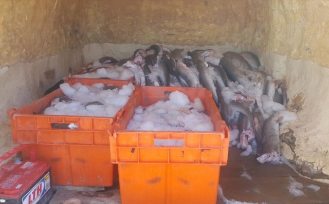 Al revisar físicamente la unidad, se percataron de que el vehículo estaba cargado con el siguiente producto marino: 409 Kilogramos de tiburón cazón, 100 kilogramos de tiburón guitarra, 26 kilogramos de tiburón angelito, 35 kilogramos de mojarra y 43 mantarraya.