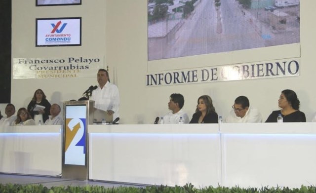 Ante miles de Comundeños que se dieron cita a la plaza de Armas Ignacio Zaragoza, declarada recinto oficial para la sesión Pública de Cabildo y con la presencia del gobernador Carlos Mendoza; del Presidente del Tribunal superior de Justicia Lic. Daniel Gallo; de la Presidenta de la Junta de Gobierno y Coordinación Política del Congreso del Estado Eda María Palacios Márquez; el Delegado de Gobernación Ricardo Millán, representante del gobierno Federal, así como de invitados especiales, el alcalde Francisco Pelayo afirmó que a dos años de asumir la responsabilidad lo ha hecho sin parar en construir las bases de un mejor futuro, sin existir tiempo perdido, con mucho esfuerzo y con la suma de voluntades se ha consolidado la infraestructura urbana y social, encabezando un gobierno sensible y cercano a la gente.