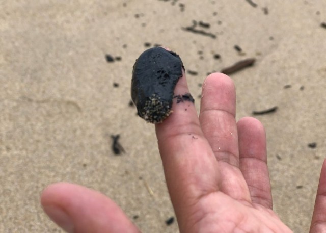 En el mar se observa una mancha negra, «es como chapopote», mencionaron los residentes de la localidad, por lo que no descartan que una veta se haya abierto y está distribuyéndose en una amplia zona del mar, «pero las olas están trayendo el petróleo a la orilla».