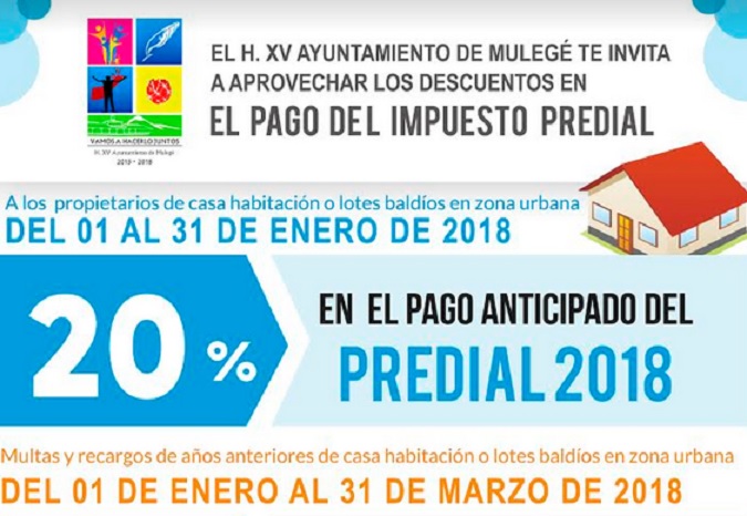 Santa Rosalía, B. C. S.- Durante todo el mes de enero continuará con un 20% de descuento el pago del impuesto predial a propietarios de casa habitación o lotes baldíos en zona urbana correspondiente al año fiscal de 2018, y un 50% de descuento en el pago de multas y recargos de 2017 y anteriores, a fin de que los contribuyentes de todo el municipio de Mulegé aprovechen la oportunidad de ponerse al corriente en sus pagos.