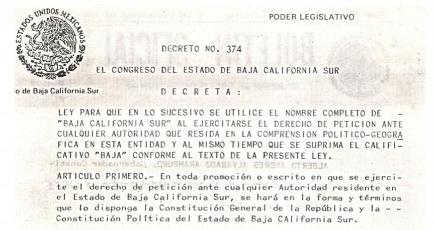 Un distinguido grupo de historiadores de la capital de nuestro estado, han tomado la determinación de hacer valer el decreto por el cual se ordena suprimir el calificativo «Baja» cuando comercialmente se haga referencia a nuestra tierra Baja California Sur, por lo que su denominación deberá ser completa.