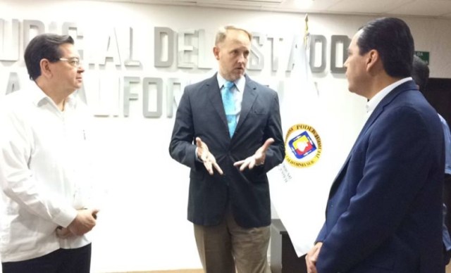 Con la finalidad de abordar temas relacionados con la operación, resultados y consolidación del Sistema de Justicia Penal, en representación del Poder Judicial del Estado, y del Magistrado Presidente del Honorable Tribunal Superior de Justicia y del Consejo de la Judicatura del Estado, Daniel Gallo Rodríguez, el Magistrado Raúl Juan Mendoza Unzón, titular de la Primera Sala Unitaria en Materia Penal, sostuvo un encuentro con el Cónsul General de los Estados Unidos en Tijuana, William A. Ostick y con la Subdirectora de la Agencia para el Desarrollo Internacional (USAID/México), Margaret Spears.