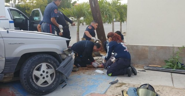 Fue la camioneta Cherokee la que prensó contra la pared a una mujer de la tercera edad que se encontraba en la esquina, donde quedó gravemente lesionada. El conocido médico José Luis Urías Corrales pasaba por el lugar y brindó los primeros auxilios junto con paramédicos del GRUPO CALAFIA que trasladaron a la lesionada al hospital FIDEPAZ.