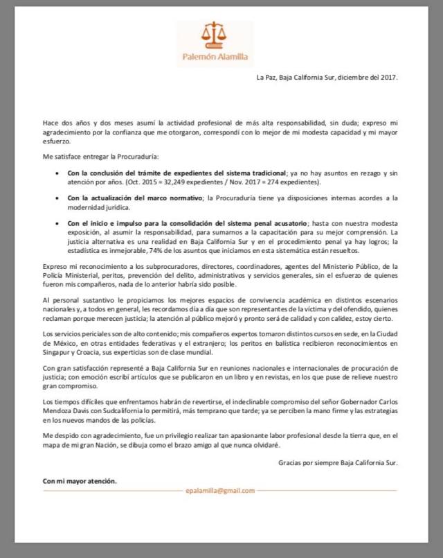 Y agregaba: “Me di al logro y Misión de crear una nueva Procuraduría de Justicia en B.C.S….Y debo decirle que cuando proteste el cargo, lo hice con pasión, con la entrega como en todos los cargos que he desempeñado ninguno ha sido fácil, y esta no era la excepción, fue como empezar de cero, aplicar un nuevo sistema nacional, el reto, desterrar vicios arraigados en un sistema tradicional (antiguo), y modernizarlo con un perfil de verticalidad, de vocación, encomendando que los nuevos funcionarios en la procuración de justicia iban hacer historia, por eso mi preocupación, mis responsabilidad”.