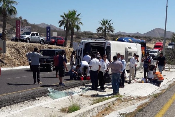 San José del Cabo (California).- Cuerpos de rescate de movilizaron al kilómetro 18.5 la mañana de hoy, donde un autobús de transporte de personal del Hotel Le Blanc volcó sobre la cinta asfáltica al salir de un vado y el chofer perdió el control de la unidad.