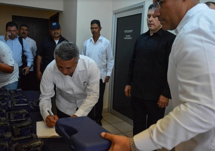 Acompañado del secretario general de Gobierno, Álvaro De la Peña Angulo, el titular de la SSPE entregó al encargado del despacho de la Presidencia Municipal, Jesús Antonio Gómez Montoya, el equipo adquirido por esta secretaría con recursos del Fondo de la Seguridad Pública en el Estado (FASEG) y de Aportaciones para la Seguridad Pública (FASP).