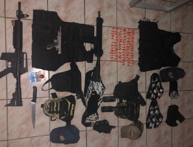 Se le encontró en posesión de equipo táctico, consistente en dos armas largas de fogueo, chalecos tácticos, funda para arma corta, pasamontañas con figuras de calaveras, cuchillo y radios de comunicación, entre otros, así como 84 envoltorios con sustancia granulada y cristalina con las características de la droga conocida como cristal, equivalente a 1000 dosis.