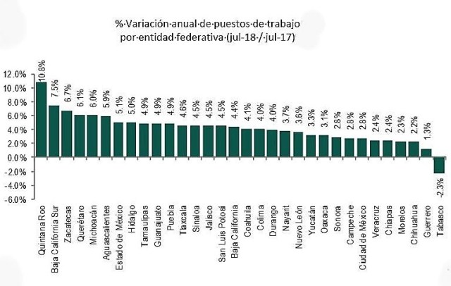 Mendoza Davis dio a conocer que al mes de julio de este año, de acuerdo al Instituto Mexicano del Seguro Social (IMSS), Baja California Sur, volvió a ocupar el segundo lugar nacional en creación de empleos formales, con un incremento anual del 7.5 por ciento, que es superior también al del mes inmediato anterior que registró un 6.7 por ciento de crecimiento.