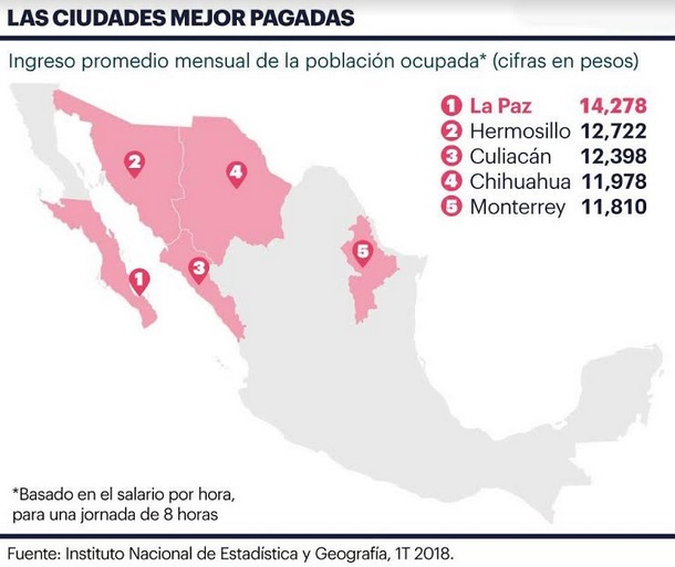 En ese sentido, agregó, La Paz es la ciudad donde al cierre del primer trimestre del presente año, la población ocupada registró el ingreso promedio mensual más alto del país con 14 mil 278 pesos, con base en el salario mínimo por una jornada laboral de 8 horas, de acuerdo al mismo INEGI; este ingreso, ubica a la capital del Estado por arriba de otras ciudades tales como: Hermosillo (12 mil 722, pesos); Culiacán (12 mil 398 pesos); Chihuahua (11, 978 pesos) y Monterrey (11 mil 810).