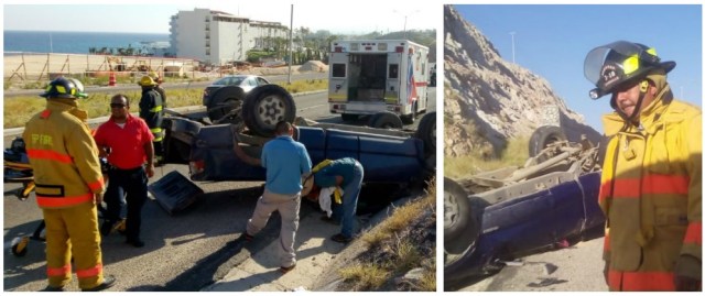 San José del Cabo (California).- Automovilistas que circulaban sobre el corredor turístico, dieron aviso a las 5:40 de la tarde de este domingo, que un automóvil había derrapado y después volcado a la altura del kilómetro 21 en el sentido de esta ciudad hacia Cabo San Lucas.