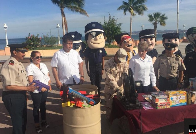 Durante el evento realizado en el Kiosko del Malecón costero de La Paz, se intercambiaron 268 juguetes entre pistolas, machetes, cuchillos y espadas, los cuales fueron destruidos en su totalidad.