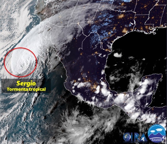 A las 19:00 horas, “Sergio”, se localizaba a 400 kilómetros al oeste sur oeste de Cabo San Lázaro, Baja California Sur, manteniendo su desplazamiento hacia el noroeste con vientos sostenidos de 95 kilómetros y rachas de 110. El pronóstico es que a las 00:00 horas estaría a 150 kilómetros al sur de suroeste de Punta Abreojos, por lo que se espera su impacto en el transcurso de la madrugada, dejando entre 10 y 11 de la mañana tierra sudcalifornianas.