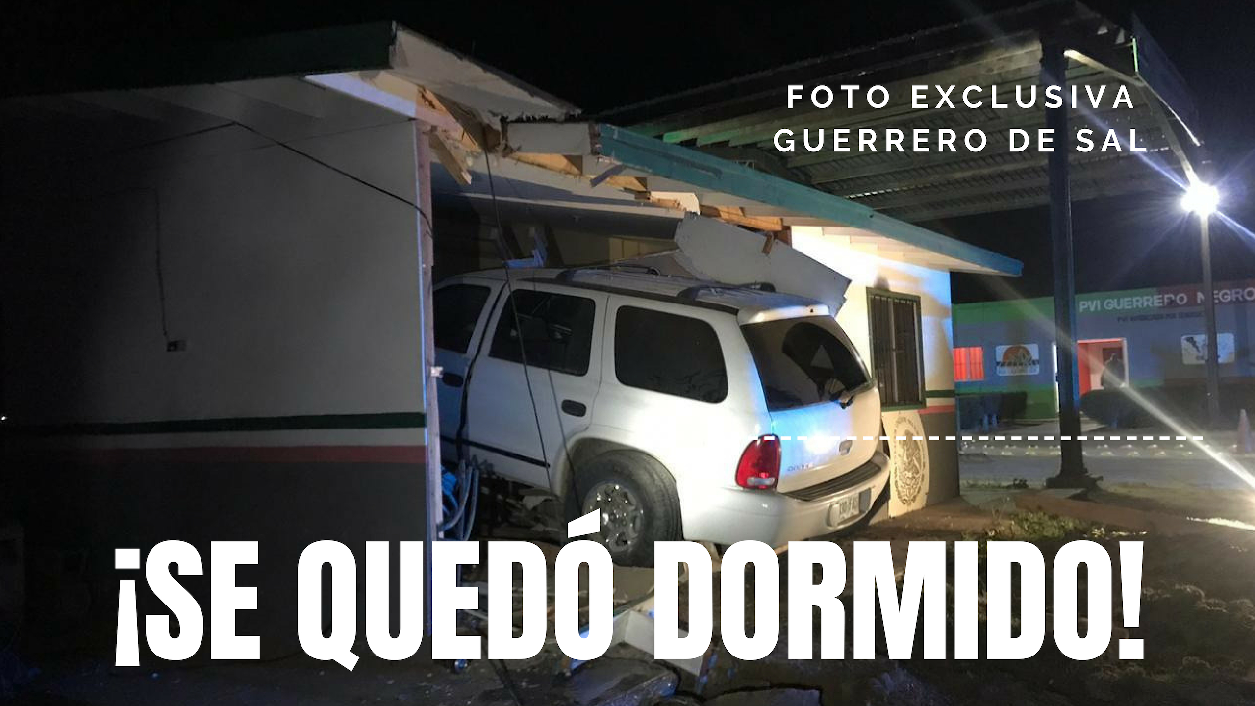 Guerrero Negro (California).- El conductor de una camioneta Dodge Durango, procedente de los Estados Unidos, fue vencido por el cansancio al llegar al paralelo 28 y en lugar de virar hacia la zona de revisión fitosanitaria, se fue derecho para estrellarse contra el módulo del Instituto Nacional de Inmigración.
