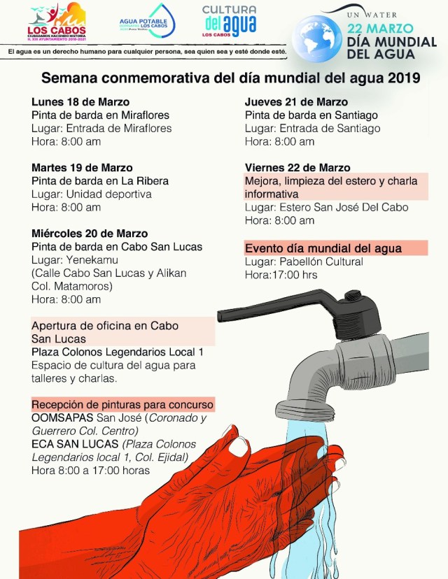 Irene Galindo, directora municipal de Cultura del Agua, del Organismo Operador Municipal del Sistema de Agua Potable, Alcantarillado y Saneamiento de Los Cabos, invita a la comunidad a las actividades alusivas al día mundial del agua que se celebra el 22 de marzo, iniciando este 18 de marzo con la pinta e barda en la delegación municipal de Miraflores.