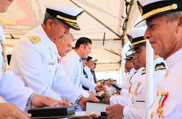 En el marco de esta ceremonia, se entregaron condecoraciones por más de 10 años de servicio ininterrumpidos a personal de la Armada de México y se tomó protesta a 25 jóvenes del primer año de la Escuela de Mecánica de Aviación Naval, quienes juraron lealtad a la bandera y a la nación.