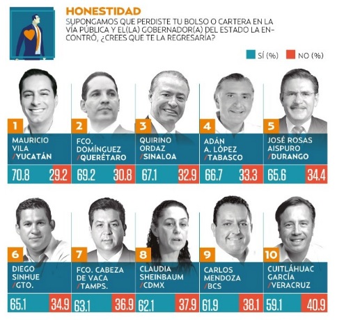 Y no resulta sorpresivo para los residentes de Baja California Sur que Carlos Mendoza Davis, en la encuesta de uno de los mejores periódicos de la ciudad de México como es El Heraldo, se haya colocado dentro del TOP TEN de los gobernadores más honestos de la república. Esto fue publicado el día de hoy por el prestigiado diario, lo que sigue colocando con buenos resultados a nivel nacional al mandatario sudcaliforniano. Recuerden que desde noviembre del año pasado los está sorprendiendo con cifras económicas que ponen a Baja California Sur dentro de los primeros lugares en el concierto nacional, lo que ya es motivo de consulta en las cosas buenas que ocurren en la entidad. Apenas hoy también Miguel Torruco de Turismo está colocando como el el primer destino de playa con mayores arribos de visitantes extranjeros a Los Cabos. ¡No se equivocaron los sudcalifornianos al tener la confianza en Carlos Mendoza Davis! Otra de las cifras más impactantes también es la disminución de la violencia, la disminución al máximo de la pobreza laboral, en fin, por eso les decíamos que muchos gobernadores de otras entidades ahora lo toman como un referente y hasta lo consultan para conocer sus métodos de buen desempeño. ¡Sí hay gobierno y rumbo en nuestra media península!