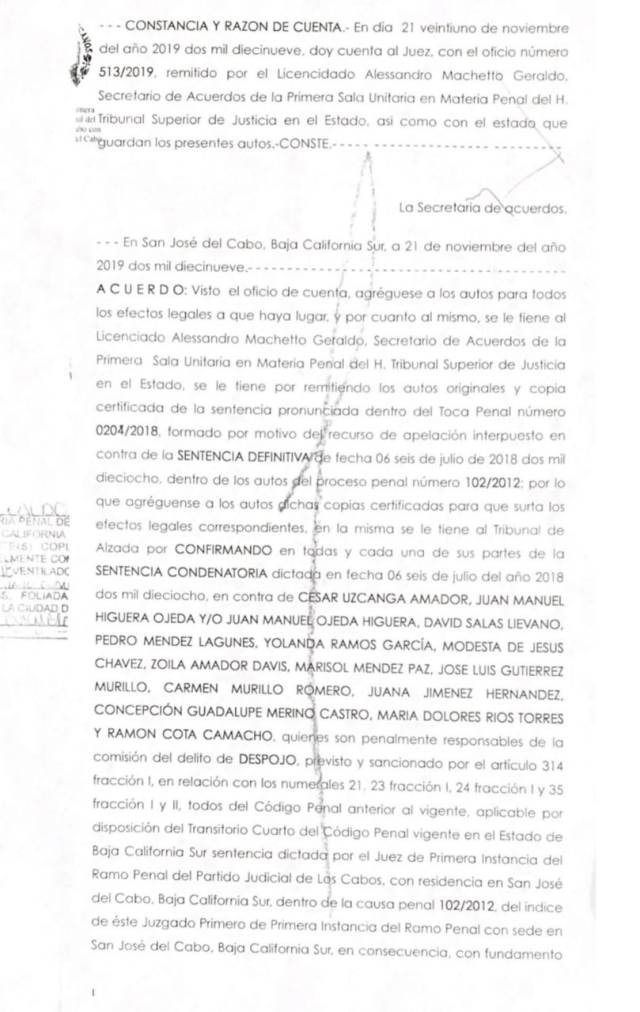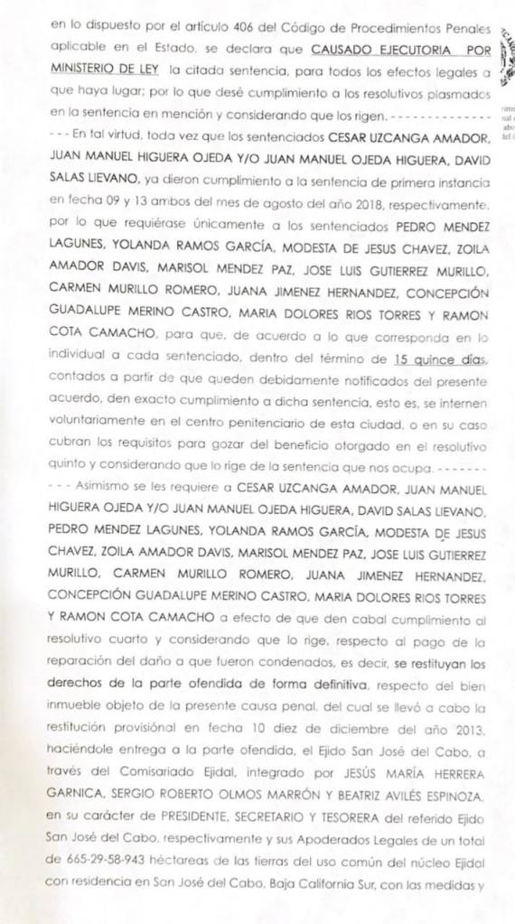 Se trata de la última sentencia pendiente y que se expide de manera lisa e inatacable por el Juzgado Primero de lo Penal de Primera Instancia del Partido Judicial de Los Cabos, por lo que de aquí en adelante, como fichas de dominó caerán todos los amparos de sujetos sin escrúpulos que intentaron despojar a los ejidatarios.