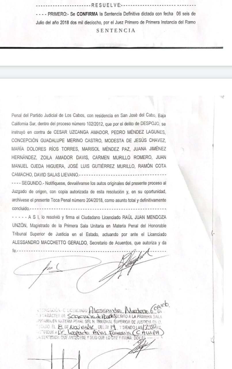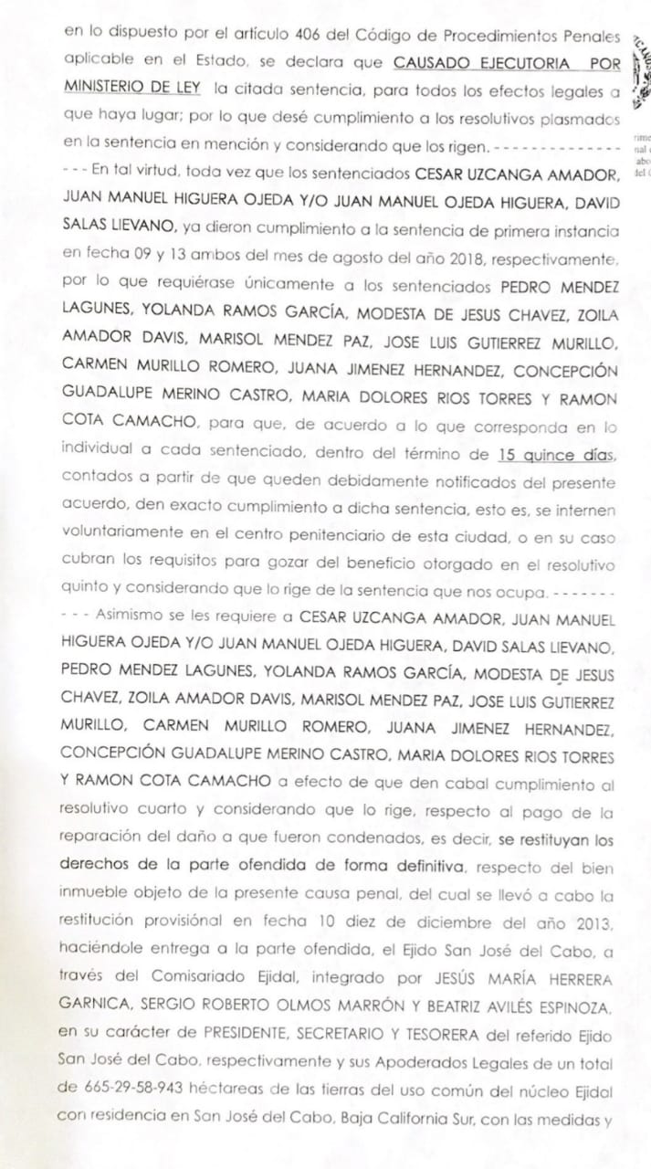 Se trata de la última sentencia pendiente y que se expide de manera lisa e inatacable por el Juzgado Primero de lo Penal de Primera Instancia del Partido Judicial de Los Cabos, por lo que de aquí en adelante, como fichas de dominó caerán todos los amparos de sujetos sin escrúpulos que intentaron despojar a los ejidatarios.