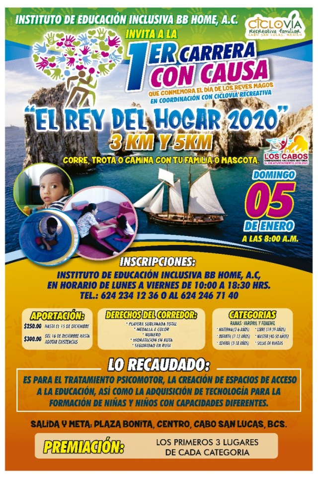El Instituto de Educación Inclusiva BB HOME A.C y el XIII Ayuntamiento de Los Cabos en coordinación con la Ciclovía Recreativa de Cabo San Lucas, se invita la población a participar en la primera carrera con causa de 3 y 5 kilómetros, “El Rey del Hogar 2020”, que se realizará el próximo domingo 5 de enero, a partir de las 8 de la mañana, para conmemorar el Día de los Reyes Magos y en la cual, puede participar toda la familia, ya sea caminando, trotando o corriendo, así informó Óscar Leggs Castro, delegado sanluqueño.