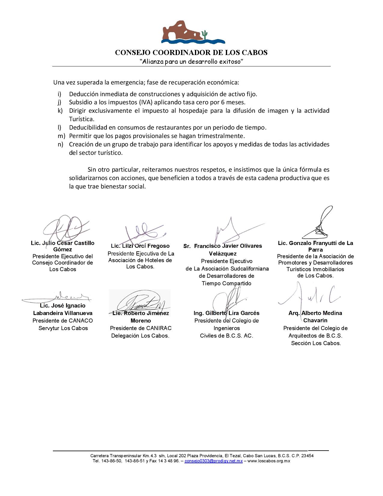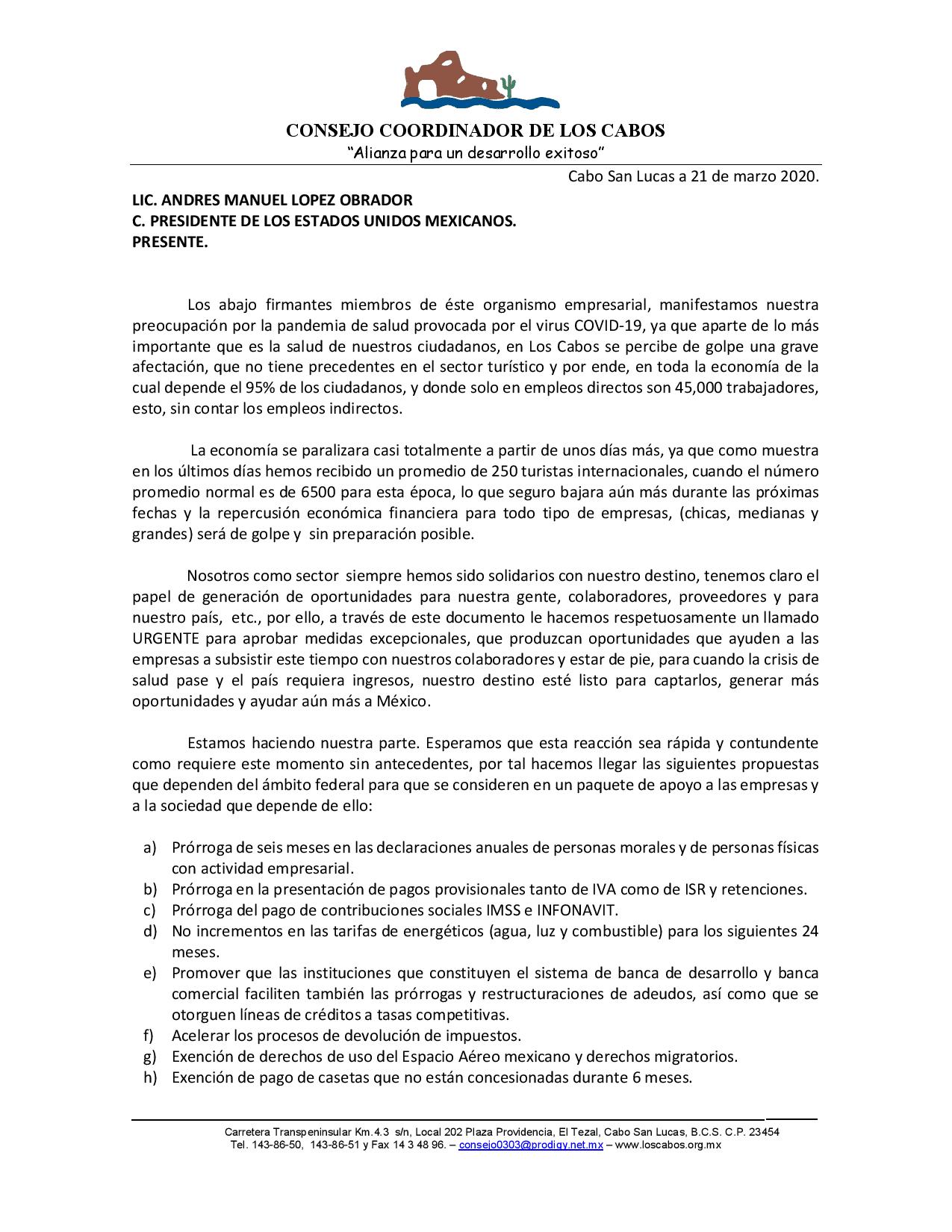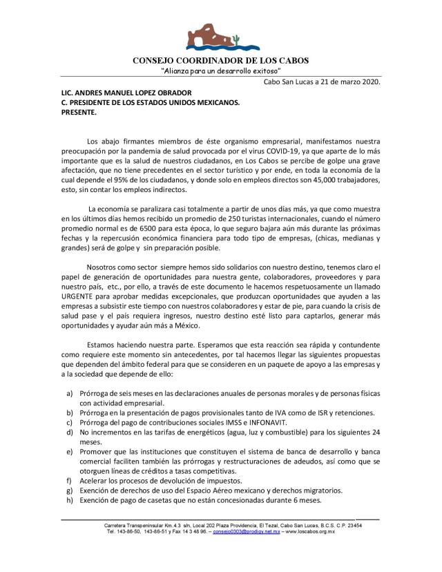 Por esa razón, los organismos empresariales que integran el Consejo Coordinador de Los Cabos, ha dirigido una misiva en carácter de urgente al presidente de la República, Andrés Manuel López Obrador, al que le piden a la brevedad «aprobar medidas excepcionales, que produzcan oportunidades que ayuden a las empresas a subsistir este tiempo con nuestros colaboradores y estar de pie, para cuando la crisis de salud pase y el país requiera ingresos, nuestro destino esté listo para captarlos, generar más oportunidades y ayudar aún más a México».
