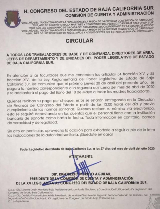 La Paz (California).- Luego de que ex diputados en complicidad con personas que nada tienen que ver con el Congreso de Baja California Sur, a través de la falsificación de sellos y documentos, pretendieron anular la cuenta bancaria mediante la cual BANORTE dispersa los recursos de salarios y bonos de trabajadores, hoy se anuncia al personal de la institución que sus pagos llegarán puntualmente a fin de que no exista confusión.