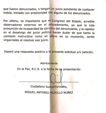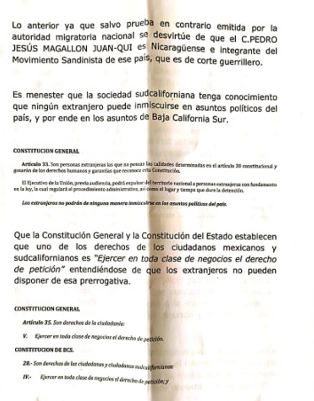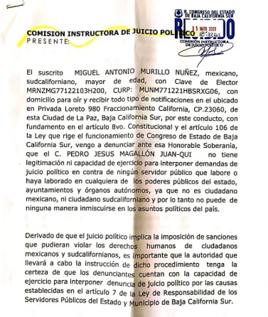 Miguel Antonio Murillo Núñez, ciudadano sudcaliforniano desenmascaró al nicaragüense en un documento que presentó ante la sección instructora del Congreso de Baja California Sur, donde señala que el acólito de Daniel Ortega, actual presidente de Nicaragua, se puede encontrar impedido para una petición de tal naturaleza, por lo que se debe dar cuenta de esta situación al Instituto Nacional de Migración, a fin de que revise el estatus del aludido y que se confirme si su estancia en territorio nacional es legal.