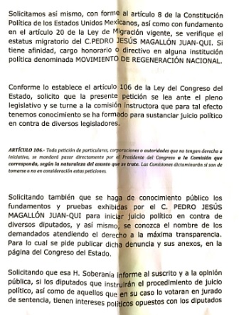 Pedro Jesús Magallón Juan-Qui, solicitó un juicio de procedencia contra legisladores locales por supuestos actos de corrupción, el 21 de abril pasado. La diputada guanajuatense Mercedes Maciel, quien también fue una de las que invitó al salvadoreño Luis Armando Díaz a participar en la política de Baja California Sur, le dio entrada a la solicitud del nicaragüense, que ahora es cuestionada.